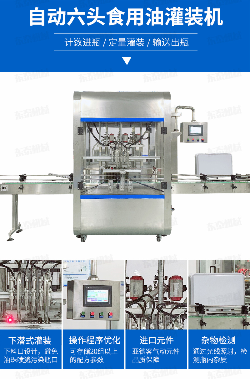 6、采用下潛式灌裝,在桶口以內(nèi)約5-8mm 處進(jìn)行灌裝,避免了灌裝速度快產(chǎn)生細(xì)小油珠噴濺污染瓶口的現(xiàn)象產(chǎn)生。配合多段式快慢速灌裝,可以保障高速灌裝時(shí)全速灌裝,又可有效解決氣壓過(guò)高快速灌裝時(shí)泡沫溢瓶現(xiàn)象,自我保護(hù)更安全,穩(wěn)定,延長(zhǎng)設(shè)備使用壽命。