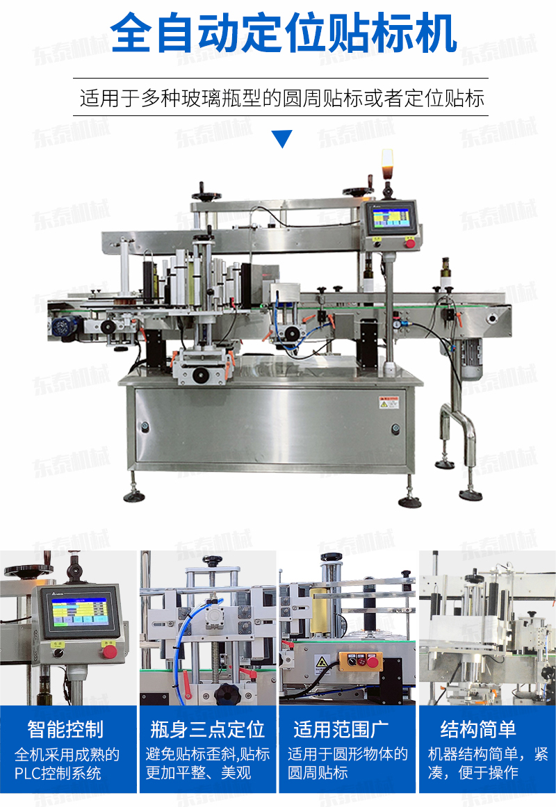 本機(jī)適用于食品、醫(yī)藥、化妝品及其它輕工行業(yè)中的扁瓶貼標(biāo)、方瓶貼標(biāo)、圓瓶貼標(biāo)之理想設(shè)備。功能操作簡(jiǎn)單,結(jié)構(gòu)緊湊。采用光電檢測(cè),PLC控制,觸摸式軟件操作,輸送帶、扶正帶、頂帶、卷瓶帶均為無(wú)級(jí)變頻調(diào)速,具有貼標(biāo)準(zhǔn)確、精度高等優(yōu)點(diǎn);同時(shí)具有無(wú)物不貼標(biāo),無(wú)標(biāo)自動(dòng)校正、自動(dòng)檢測(cè)等功能。本機(jī)既可單機(jī)使用,也可與其它包裝機(jī)自動(dòng)連線使用。