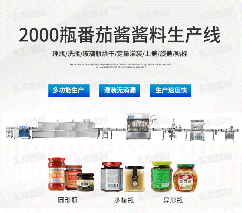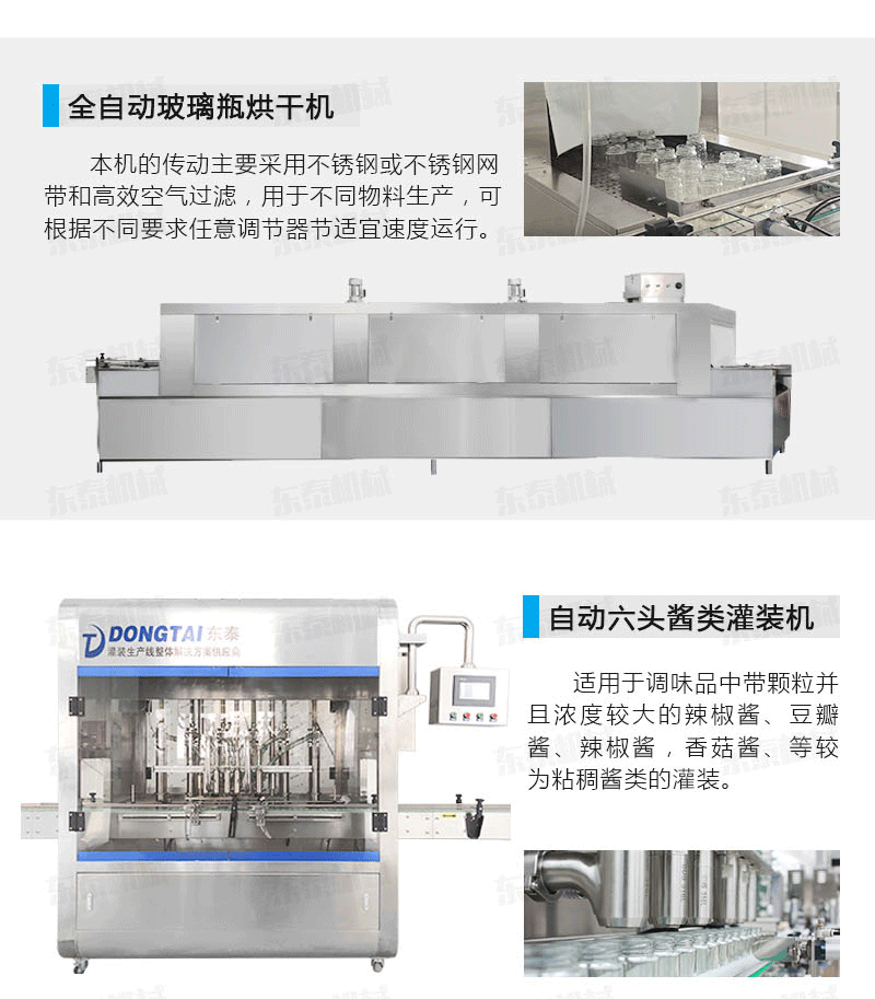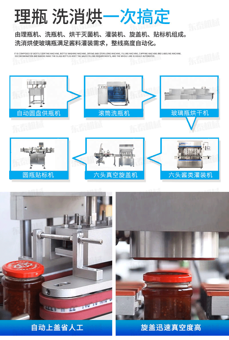 番茄醬灌裝旋蓋生產設備組成: 自動供瓶機+全自動滾筒洗瓶機+自動六米烘干機+自動收瓶機+全自動六頭灌裝機自動灌裝+全自動提蓋機自動理蓋、提蓋、掛蓋+六頭真空旋蓋機同時六個頭真空旋蓋+套標機+收縮