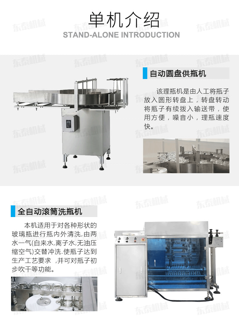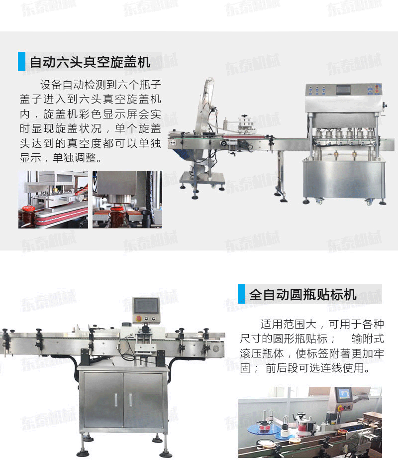 自動供瓶機+全自動滾筒洗瓶機+自動六米烘干機+自動收瓶機+全自動六頭灌裝機自動灌裝+全自動提蓋機自動理蓋、提蓋、掛蓋+六頭真空旋蓋機同時六個頭真空旋蓋+套標機+收縮機+圓瓶貼標機+整理平臺;